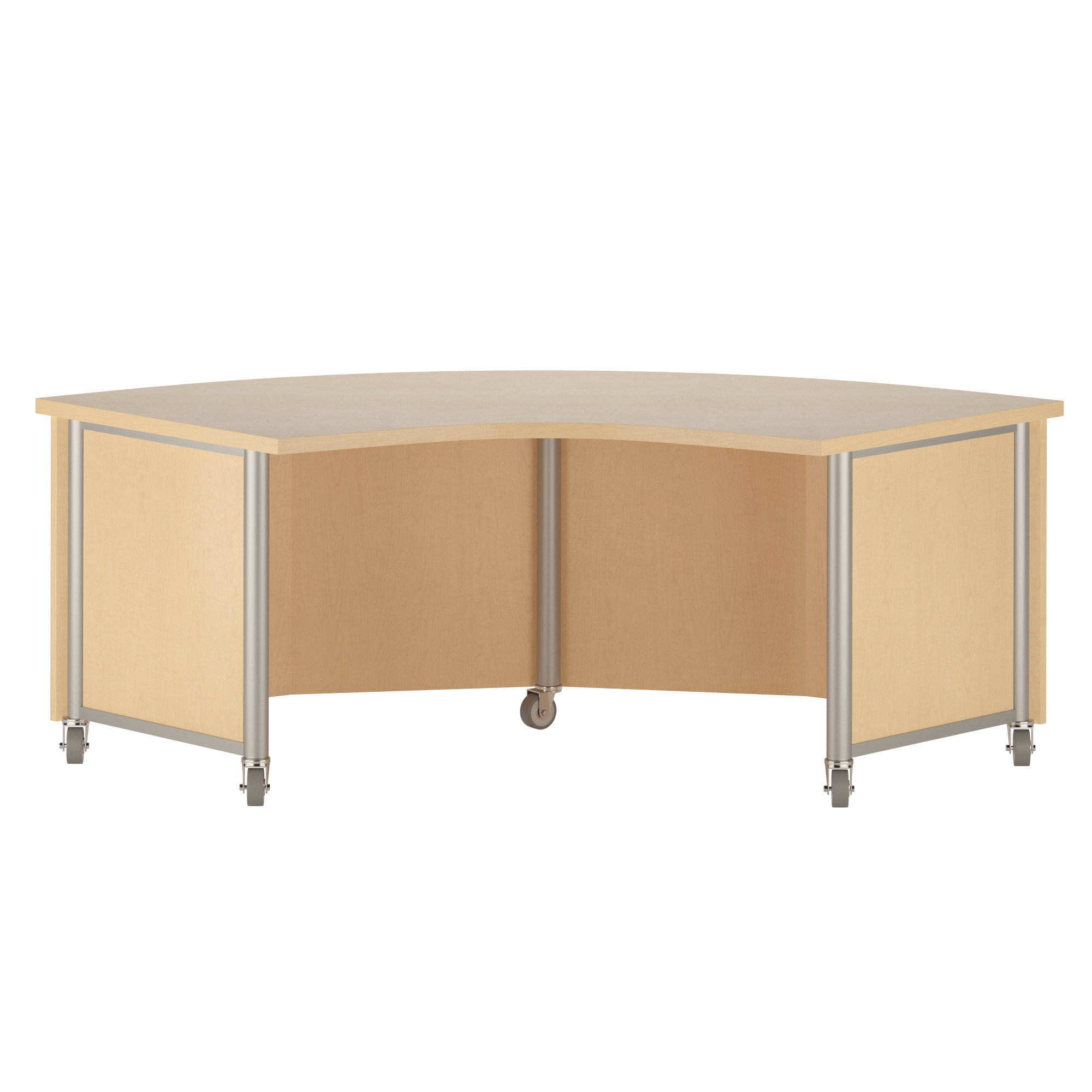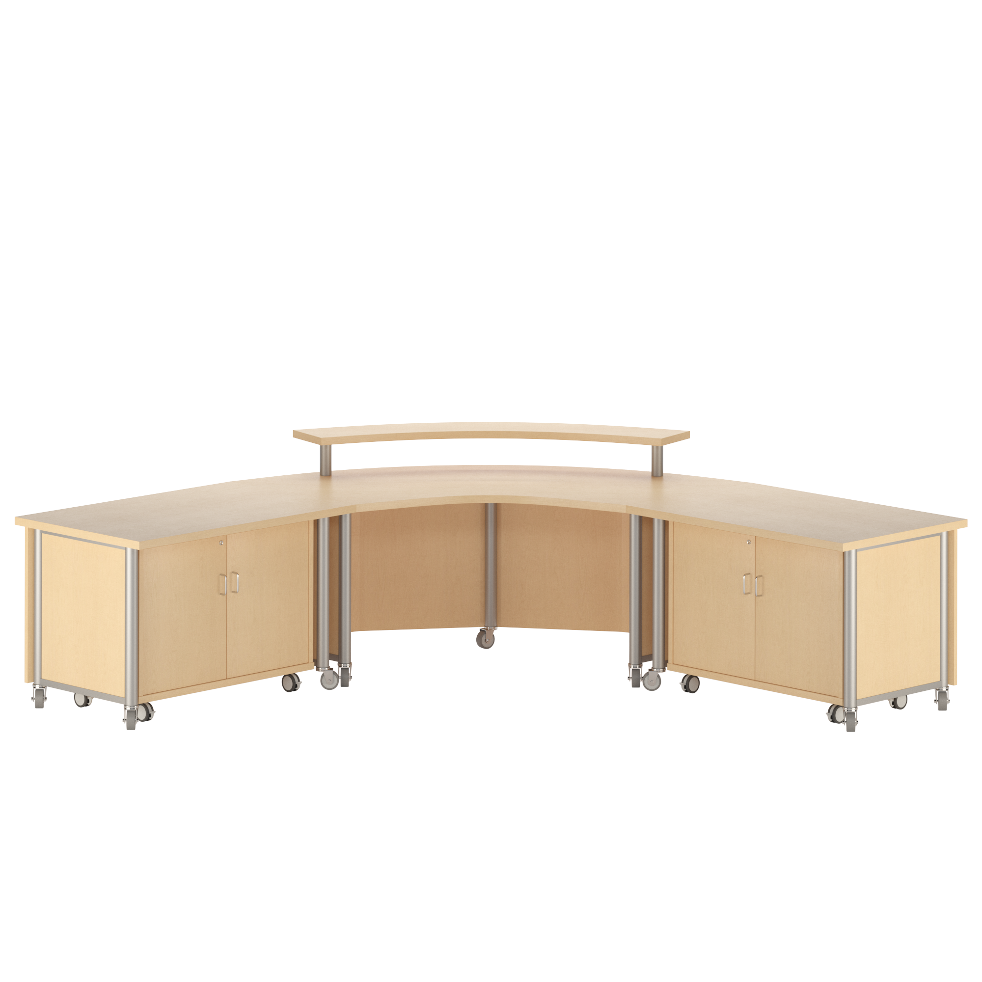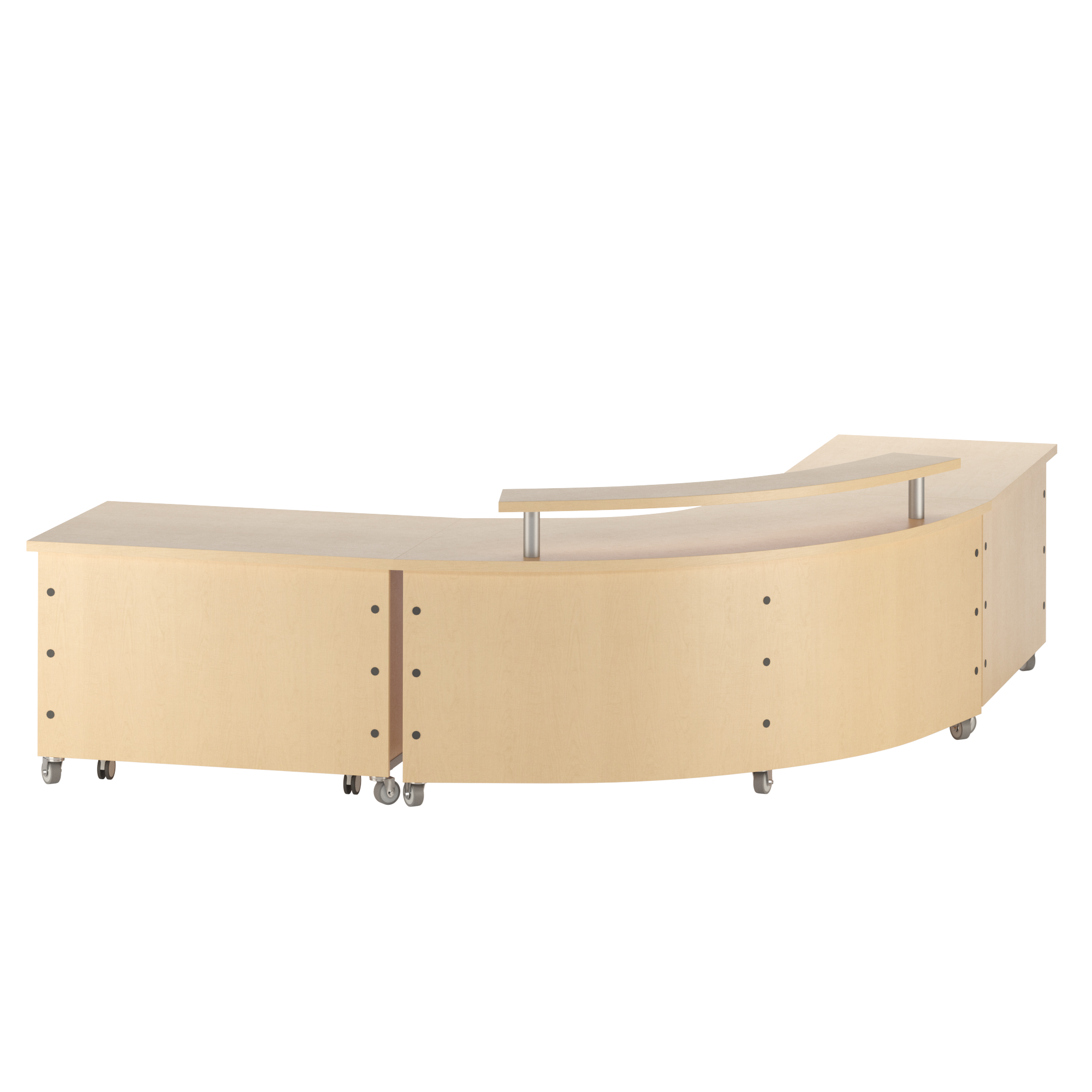Tesco’s unique metal post legs create a contemporary design for this Mobile Desk style. Units selected can be pushed together but the design does not allow for ganging and a seamless look like the Platform Base achieves. Specialty and Storage Units ordered need a corresponding radius shell unit to achieve the functionality and look desired.